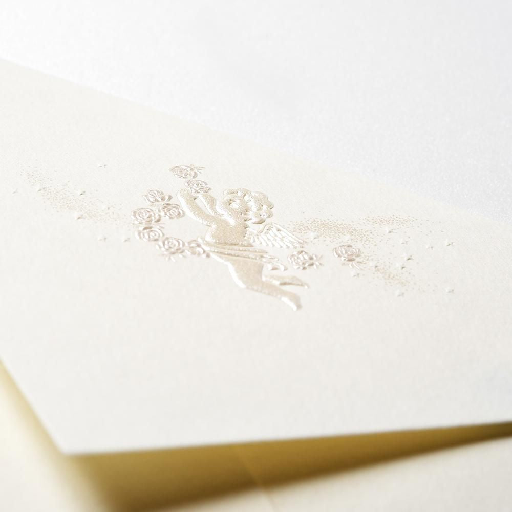 The envelope features a elegant pearlescent embossing of an angel wearing a rose garland. Recommended for bridal, birth & romantic occasions.